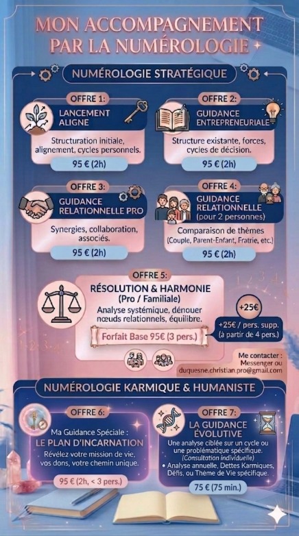Vous ne subissez pas votre destin, vous le co-créez. 🧭 Je vous propose une séance de haute précision en Numérologie Karmique et Humaniste pour décoder les mémoires de votre âme, vos ressources cachées et les cycles de votre incarnation.